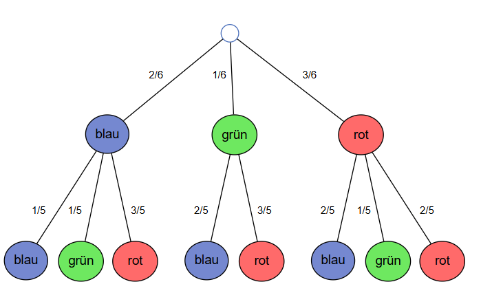 In einer Urne befinden sich drei rote, zwei blaue und eine grüne Kugel, also insgesamt 6 Kugeln. Es wird zweimal eine Kugel (ohne zurücklegen) gezogen und ihre Farbe notiert.